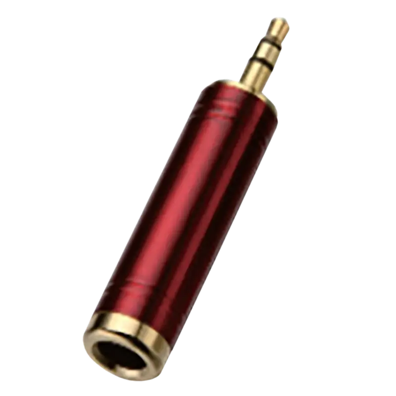 Adaptador de audio estéreo Jack 3.5 mm, fabricado en aleación de aluminio con acabado en oxidación roja y punta de latón dorada, ideal para conexiones de alta fidelidad en entornos profesionales.
