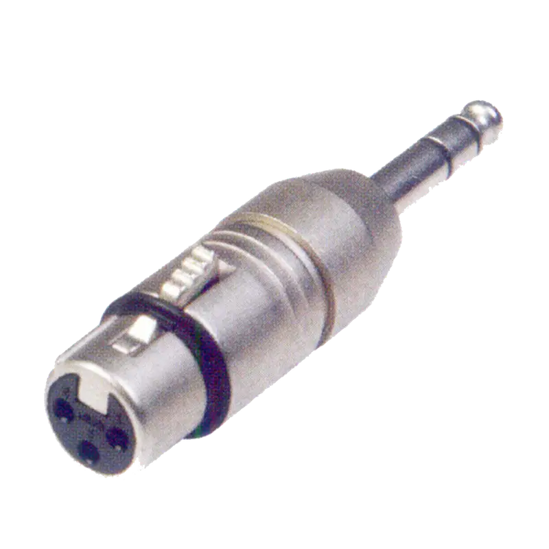 Conector XLR a plug 1/4" estéreo, fabricado en metal niquelado, ideal para transmisión de señales de audio y conexiones profesionales.