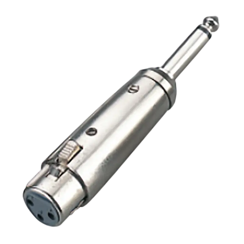 Conector XLR a Plug 1/4" mono de aleación de zinc niquelado, ideal para transmisión de señales y conexiones de audio.