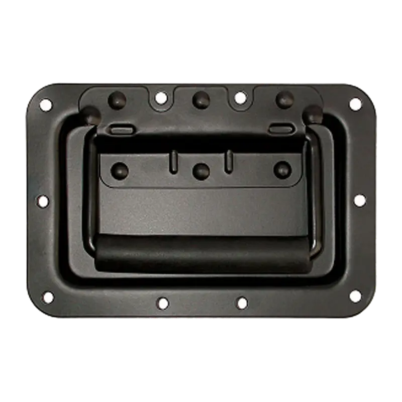 Agarradera de presión en acero inoxidable, ideal para montaje y protección en cajas acústicas, racks y gabinetes, acabado en color negro.