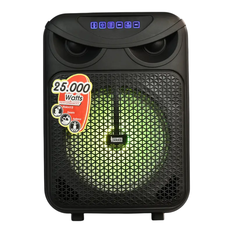CAJA AMPLIFICADA CON BATERIA 8 PULG., 12.000W PMOP, REPRODUCTOR ANALOGICO DIGITAL, ENTRADA MIC 1/4, 3.5MM , EFECTO ECO, BASS & TREBLE, LUZ LED RGB, INCLUYE UN MICROFONO