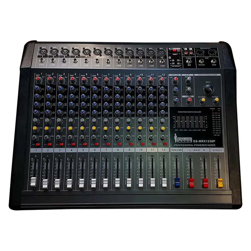 Consola de Mezclas Profesional ESMRX1238P Consola digital de 13 canales con USB, efectos integrados, ideal para eventos en vivo y estudios.