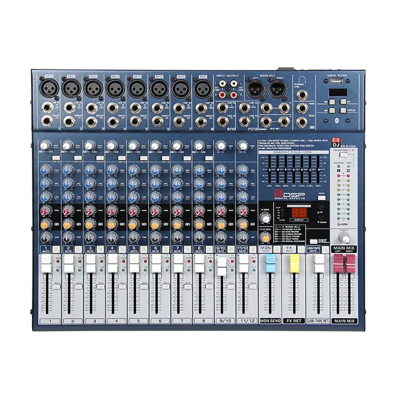 Consola digital de 12 canales con interfaz USB, efectos digitales y Bluetooth, ideal para eventos y estudios.