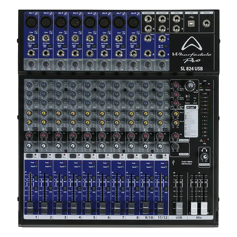 Consola Analógica SL824USB Resumen técnicocomercial: Consola de 12 canales, analógica, con interfaz USB, efectos integrados, ideal para eventos en vivo, estudios y transmisiones.
