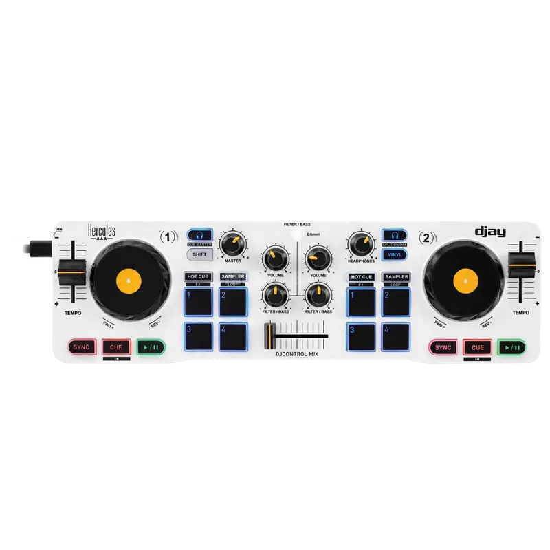 Controlador DJ compacto con conectividad USB y Bluetooth, compatible con software DJUCED y otras aplicaciones móviles, ideal para DJs intermedios y profesionales.