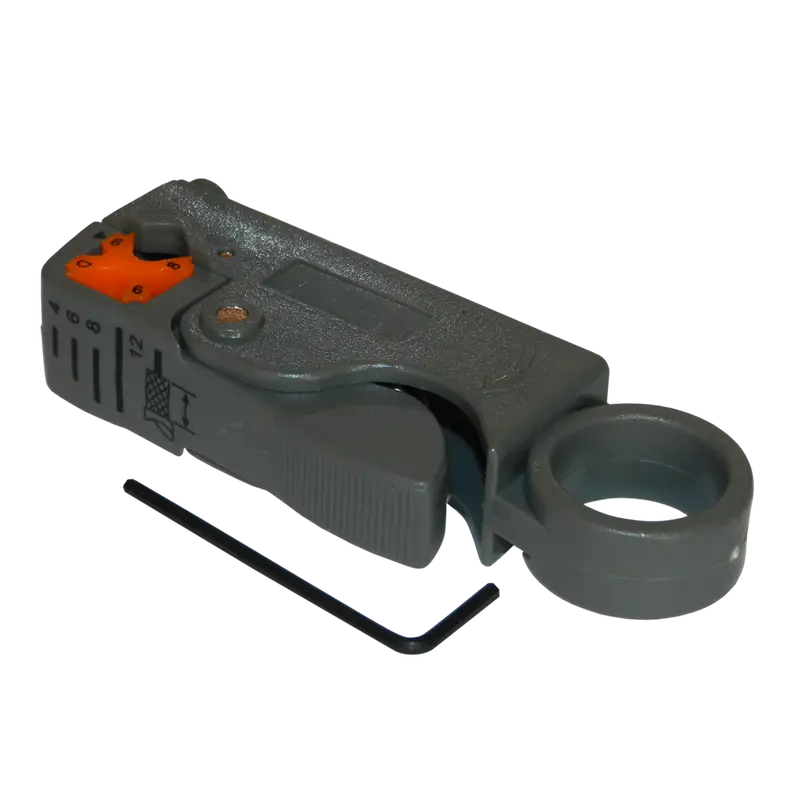 Cortadora de cables coaxiales de alta precisión en aluminio, ideal para ensamblaje y mantenimiento de conexiones.
