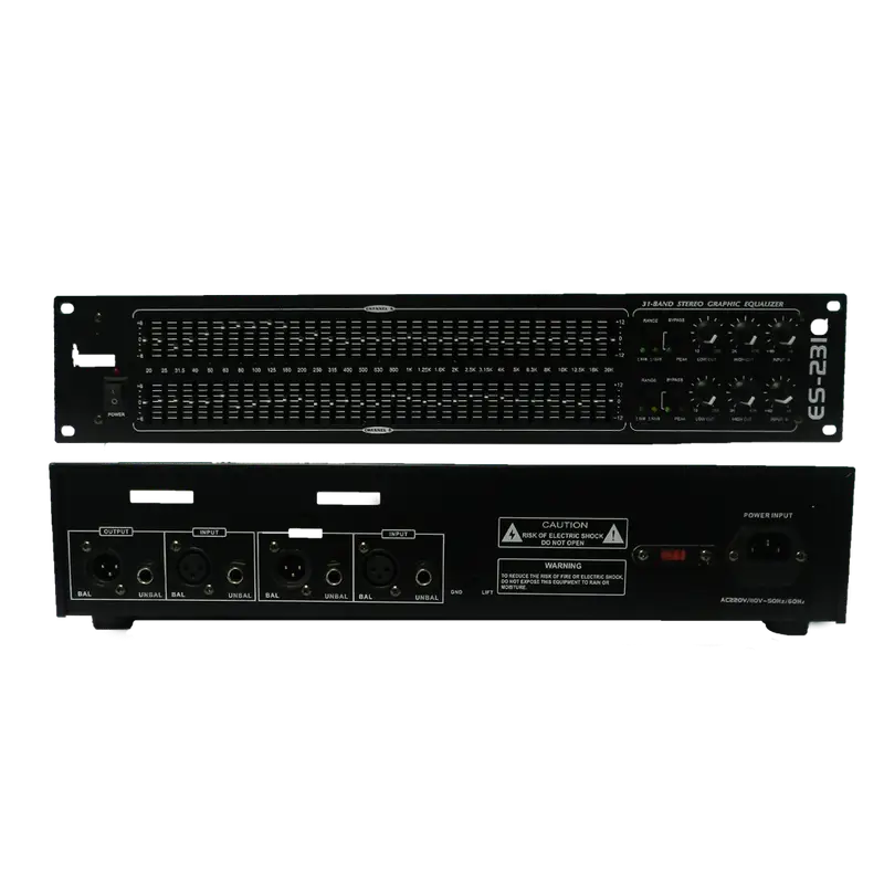Ecualizador gráfico profesional de 31 bandas por canal, diseñado para ajuste preciso en instalaciones fijas y sistemas PA en vivo.