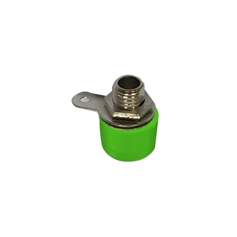 Conector tipo banana de chasis pequeño en verde, ideal para transmisión de señales y conexiones de audio, fabricado en metal resistente.