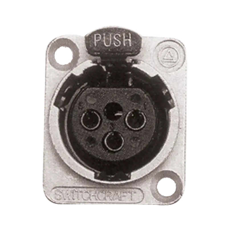Conector XLR metálico para transmisión de señales de audio y alimentación eléctrica, ideal para entornos profesionales.