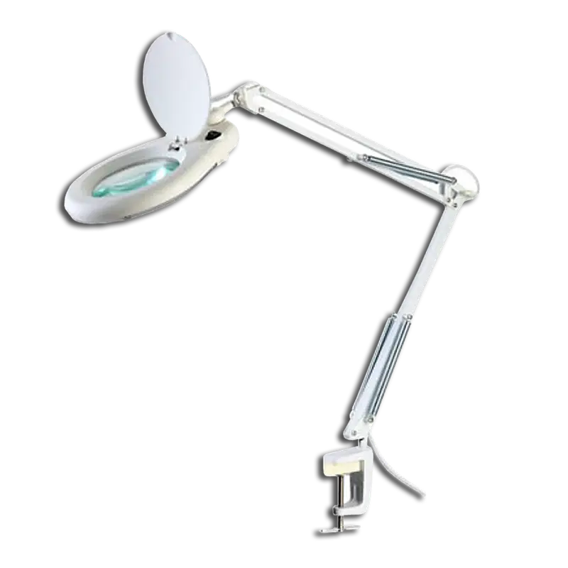 Lámpara con lupa articulada de aluminio, ideal para trabajos de precisión en electrónica, joyería y reparación de circuitos.