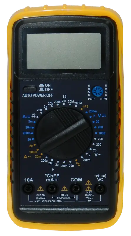 Multímetro digital robusto en carcasa de plástico ABS, ideal para diagnóstico eléctrico, medición de corriente y análisis de señales.