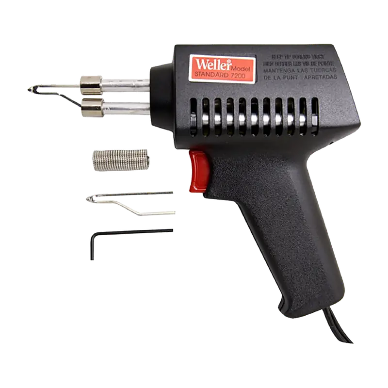 Pistola de soldar de alta eficiencia, fabricada en plástico ABS y metal, ideal para ensamblaje de circuitos y soldadura.