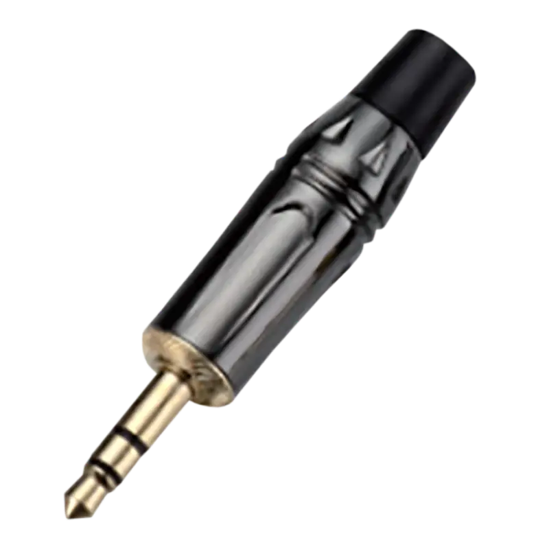 Conector plug 3.5 estéreo de aleación de zinc y punta dorada, ideal para transmisión de señales de audio y conexiones de datos.