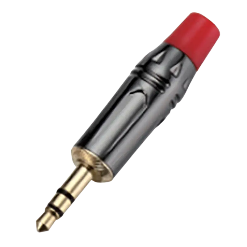 Conector estéreo de 3.5 mm en aleación de zinc y PVC rojo, ideal para transmisión de audio y señales en sistemas profesionales.
