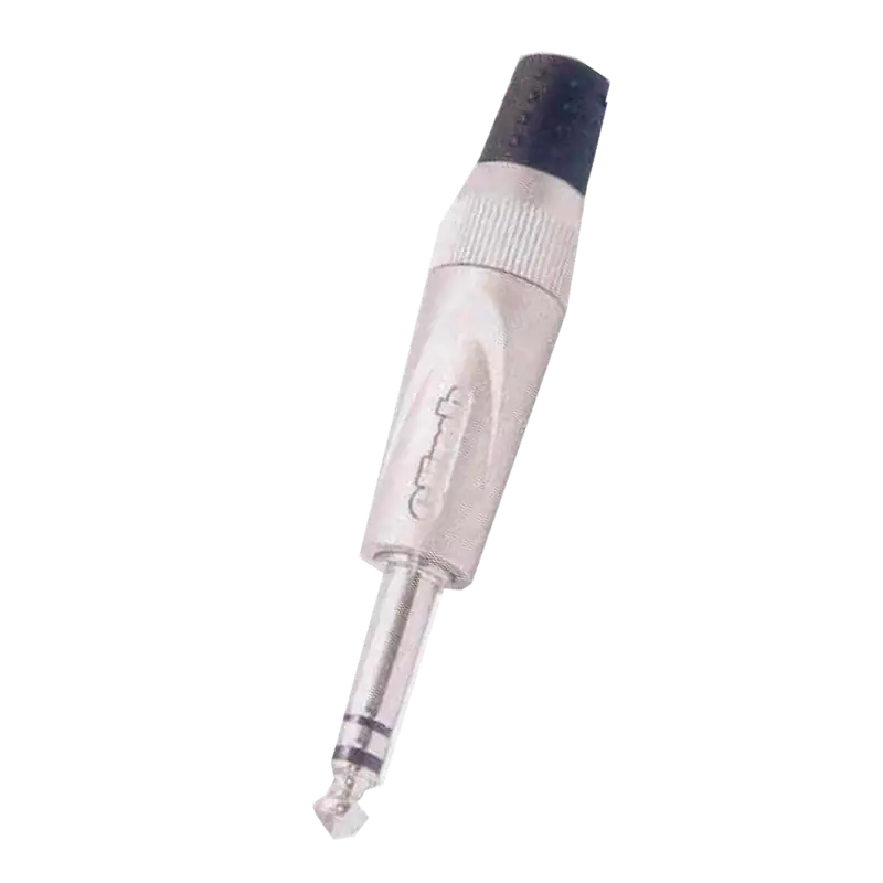 Conector Jack 1/4" estéreo de aluminio, ideal para transmisión de señales de audio y conexiones en sistemas de sonido profesional.
