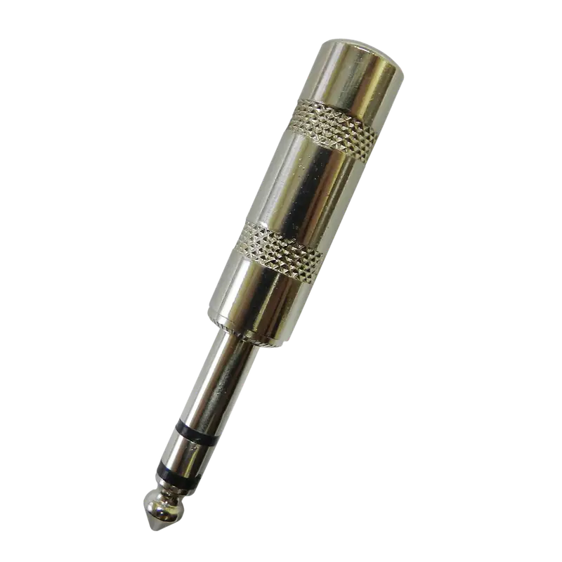 Conector de audio tipo Jack 6.3 mm estéreo, fabricado en metal niquelado, ideal para transmisión de señales de audio en sistemas profesionales.