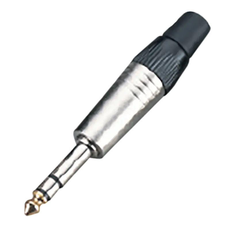 Conector plug 6.3 estéreo de alta calidad, diseñado para uso profesional en audio, con aleación de zinc niquelado y punta dorada para una mejor transmisión de señal.