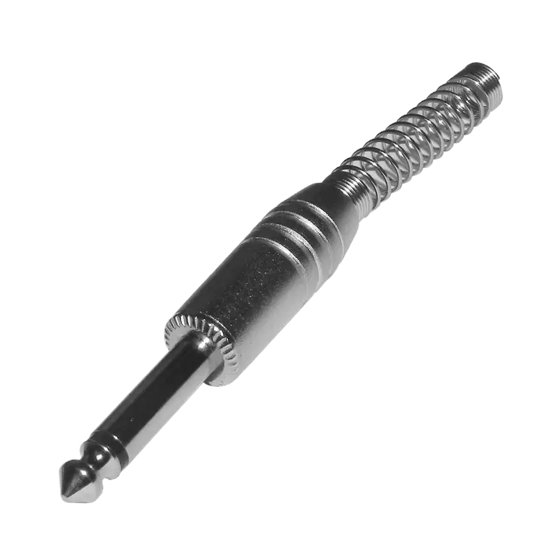 Conector mono de 6.3 mm, fabricado en metal resistente, ideal para aplicaciones de audio profesional y transmisión de señales.