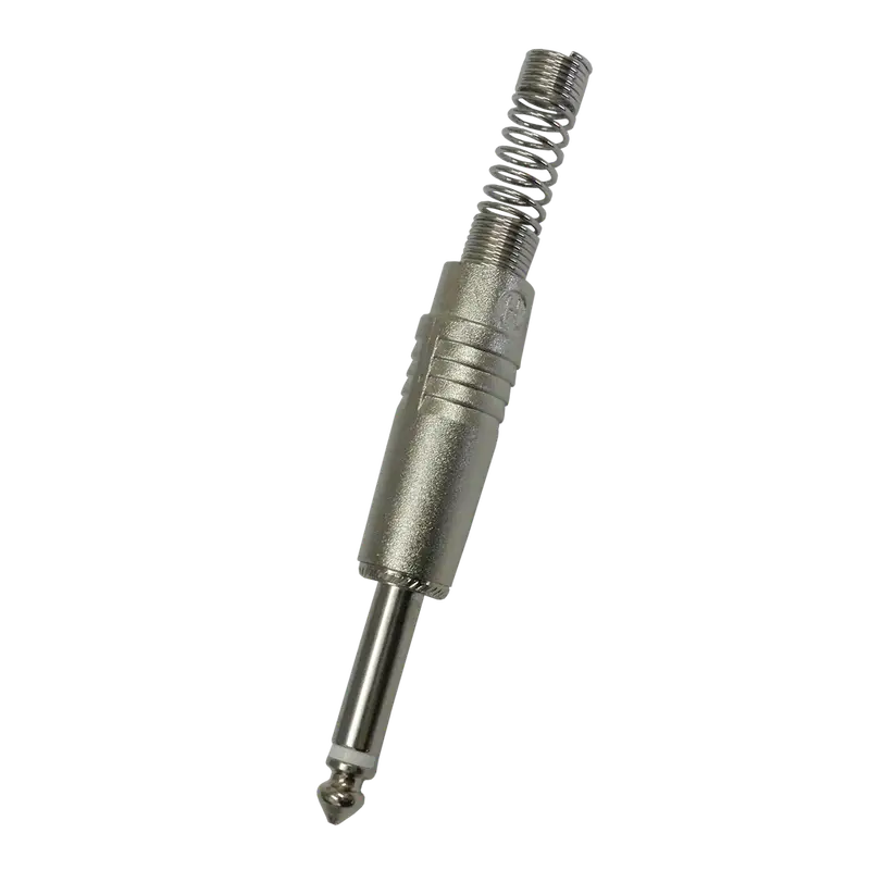 Conector de audio tipo Plug 1/4" mono, fabricado en metal niquelado, ideal para sistemas de sonido y grabación.