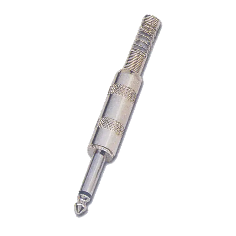 Conector Plug 1/4" mono, fabricado en metal niquelado, ideal para transmisión de señales y conexiones de audio.