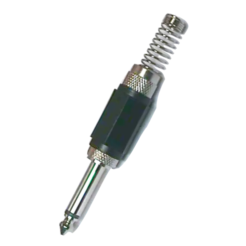 Conector tipo Jack 6.3 mono, fabricado en metal niquelado, ideal para transmisión de señales de audio y conexiones robustas.