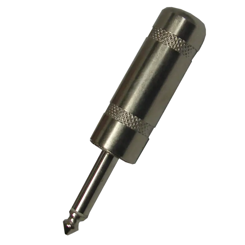 Conector mono de 6.3 mm en metal robusto, ideal para transmisión de señales de audio y conexiones de instrumentos musicales.