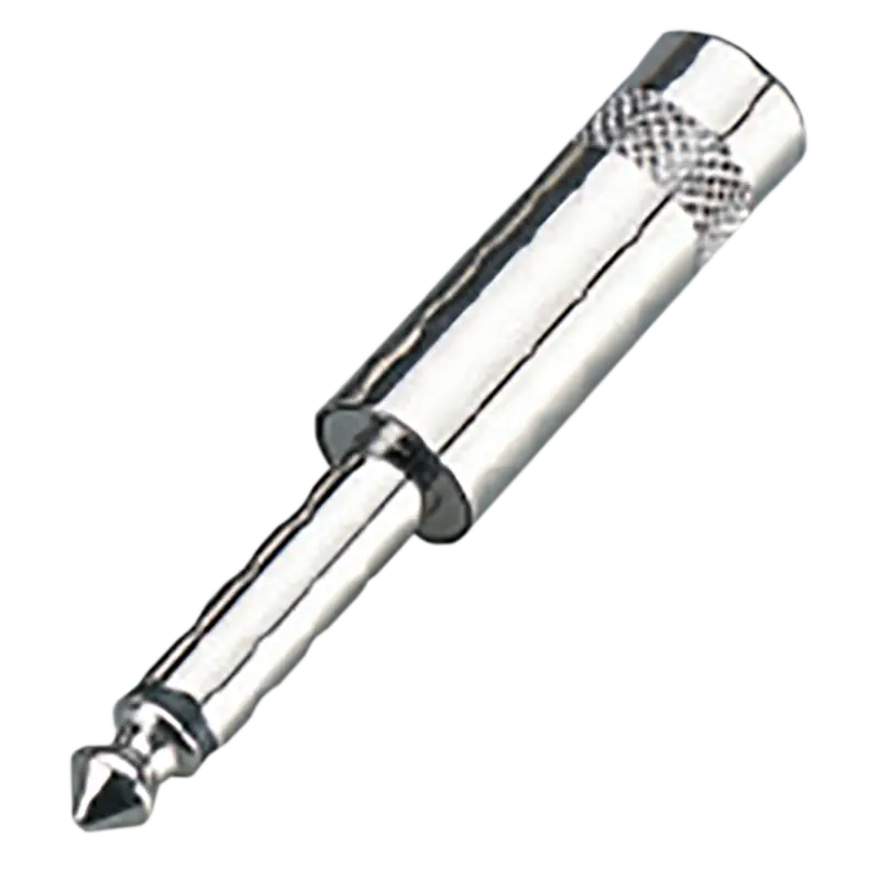 Adaptador de audio profesional de 6.3 mm mono, diseñado con aleación de zinc y punta de latón niquelado, ideal para conexiones seguras y duraderas en estudios y eventos en vivo.