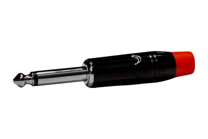 Adaptador de audio mono 6.3 mm con diseño robusto, acabado en níquel y punta dorada, ideal para aplicaciones profesionales de sonido.