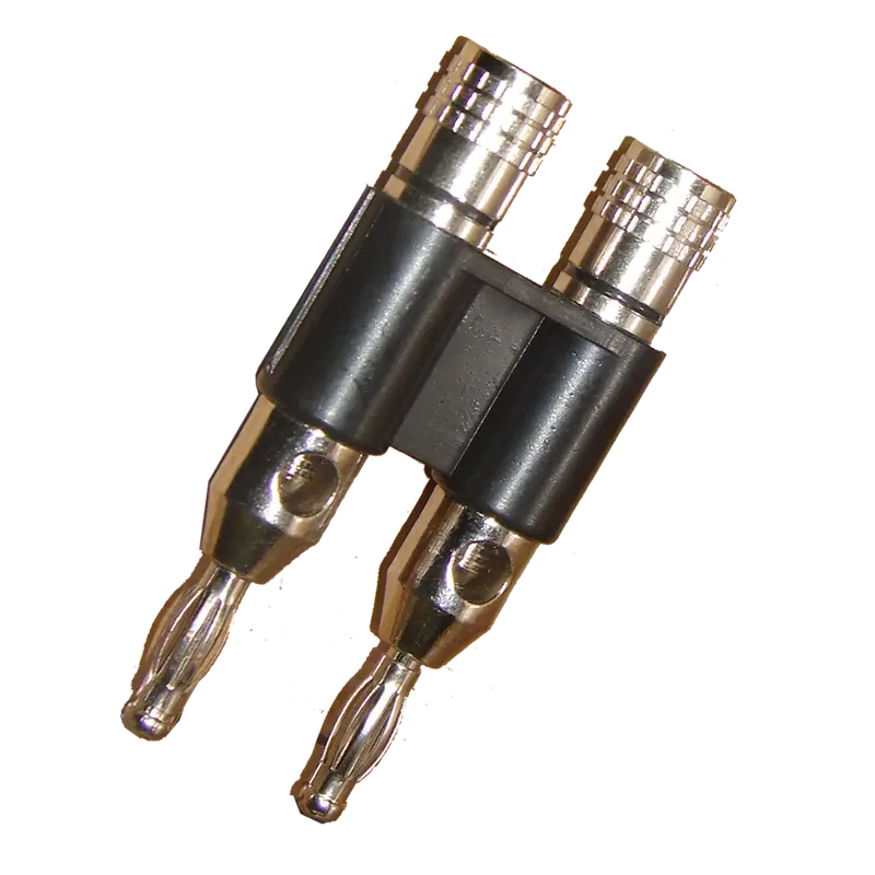 Conector doble tipo banana en metal niquelado, ideal para transmisión de señales y conexiones de audio en sistemas profesionales.