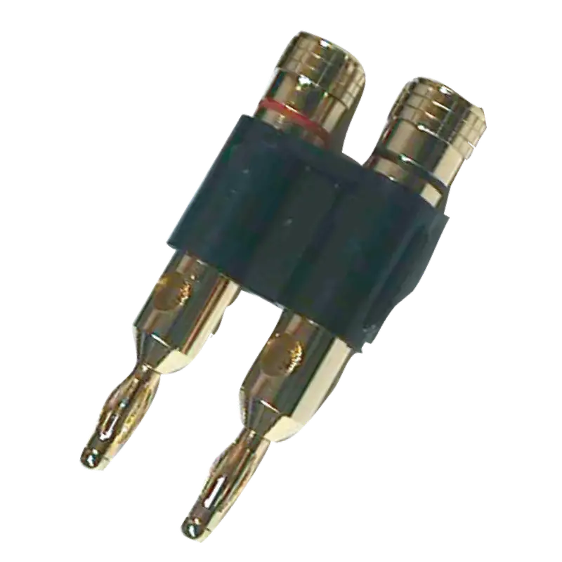 Conector tipo banana doble, fabricado en metal, ideal para conexiones de audio y transmisión de señales.