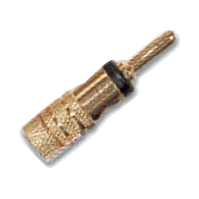 Conector tipo plug banana dorado, fabricado en metal, ideal para transmisión de señales y conexiones de audio.