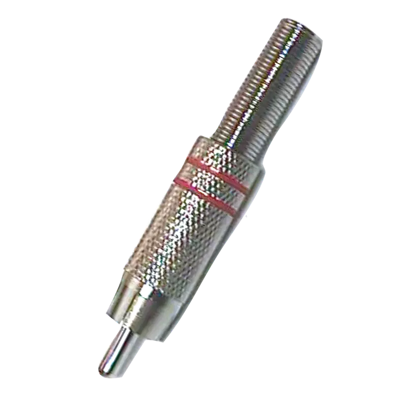 Conector RCA metálico para transmisión de señales de audio y datos, ideal para sistemas de sonido profesional.