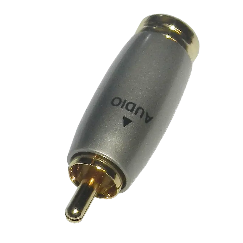 Conector RCA metálico, ideal para transmisión de señales de audio, fabricado en aluminio niquelado, robusto y duradero.