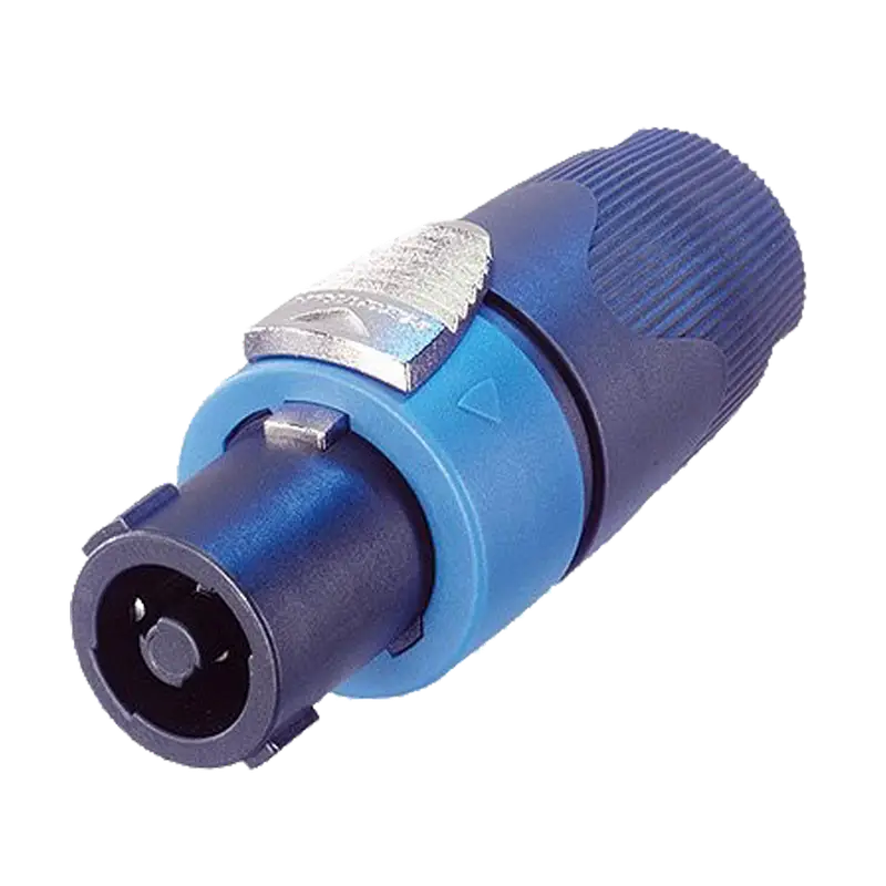Conector Speakon NL4FX de 4 vías, fabricado en metal resistente, ideal para conexiones de audio y transmisión de señales.