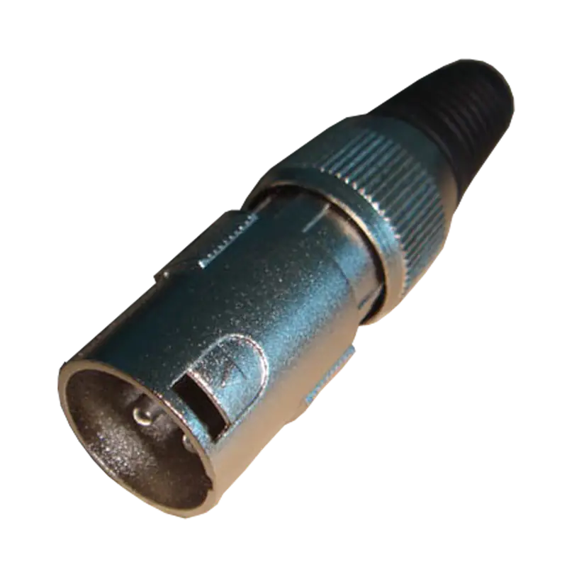 Conector XLR metálico robusto para transmisión de señales de audio y datos, ideal para aplicaciones profesionales.