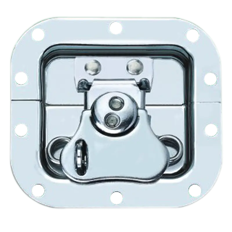 Seguro metálico tipo rack BTS17, fabricado en chapa de acero laminado en frío con acabado cromado, ideal para racks, flight cases y cajas acústicas, dimensiones de montaje precisas.